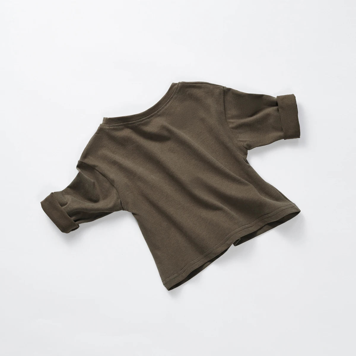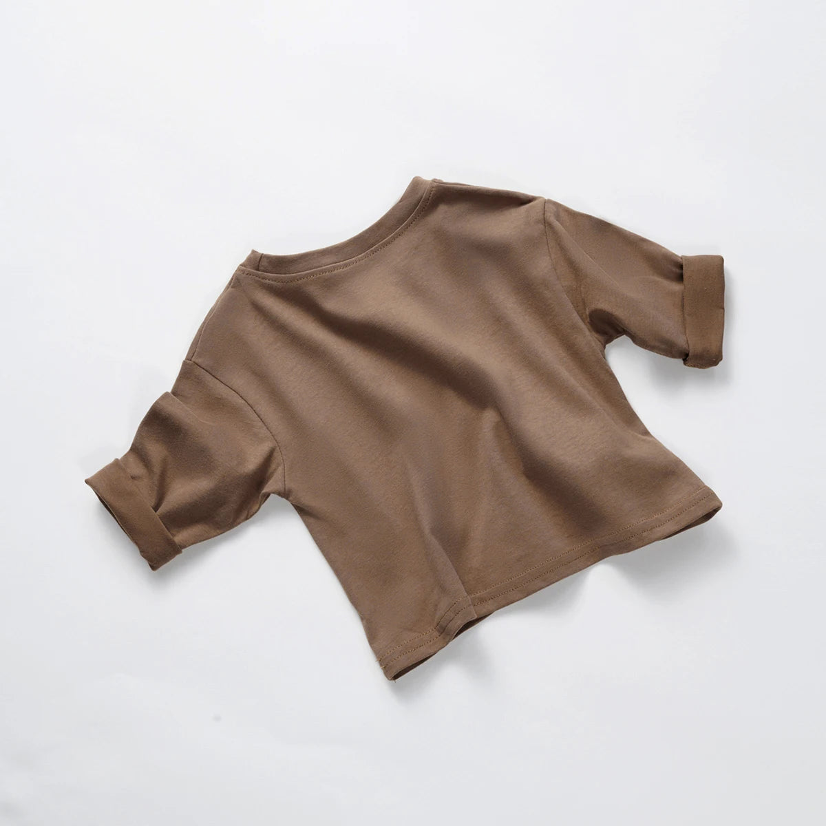 Minimalistyczna koszulka dziecięca z długim rękawem, wykonana z miękkiej i przyjemnej w dotyku bawełny. Prosty, lekko oversize’owy krój zapewnia wygodę i swobodę ruchów, co czyni ją idealnym wyborem na co dzień – zarówno do przedszkola, jak i w domu.