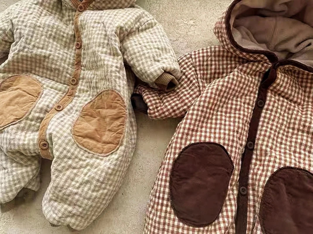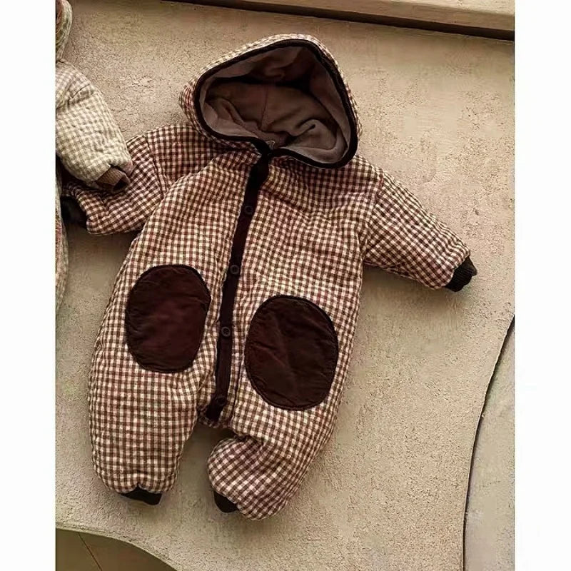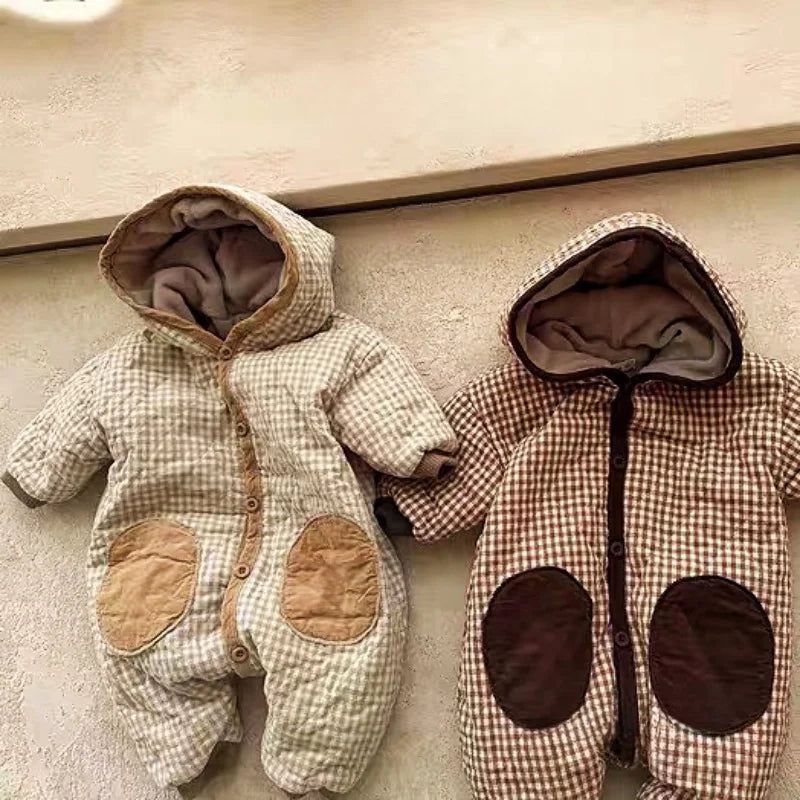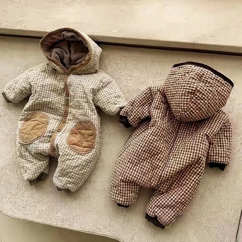 Otul swoje maleństwo miękkością i ciepłem dzięki naszemu uroczemu kombinezonowi zimowemu! Ten uroczy model dostępny jest w dwóch klasycznych wersjach kolorystycznych: beżowej oraz bordowej, obie w delikatną kratkę z kontrastowymi, owalnymi kieszonkami. Idealny wybór na chłodne dni!