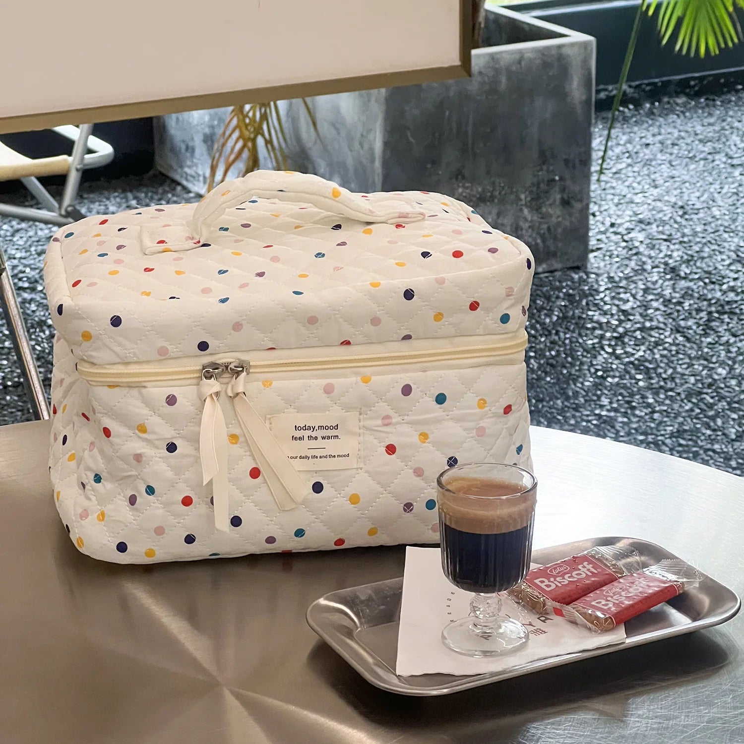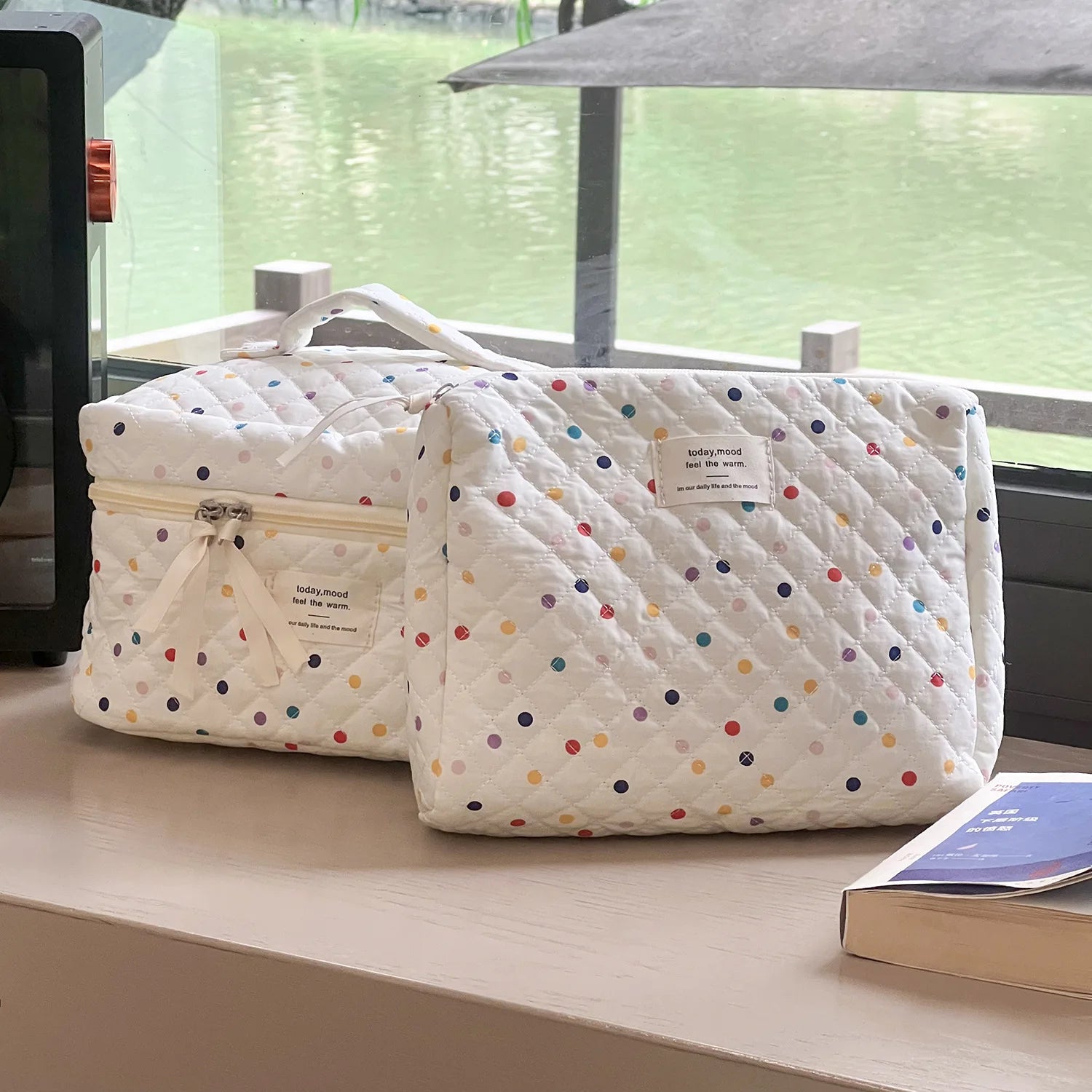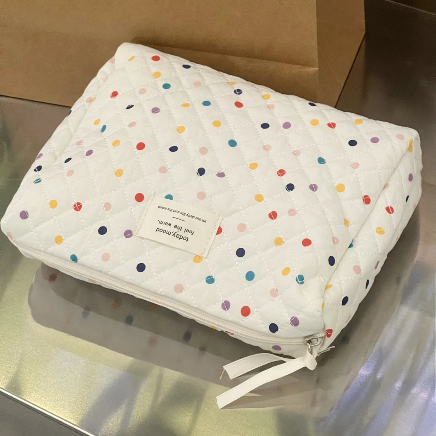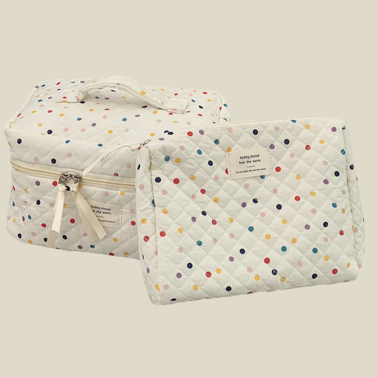 Pikowana kosmetyczka w kolorowe kropeczki, dostępna w dwóch rozmiarach – mniejszym i większym. Idealna do przechowywania akcesoriów dla mamy i dziecka, świetnie sprawdzi się zarówno w domu, jak i w podróży czy wózku. Lekka, praktyczna i jednocześnie pełna uroku, pomoże utrzymać porządek w drobiazgach, które zawsze warto mieć pod ręką.