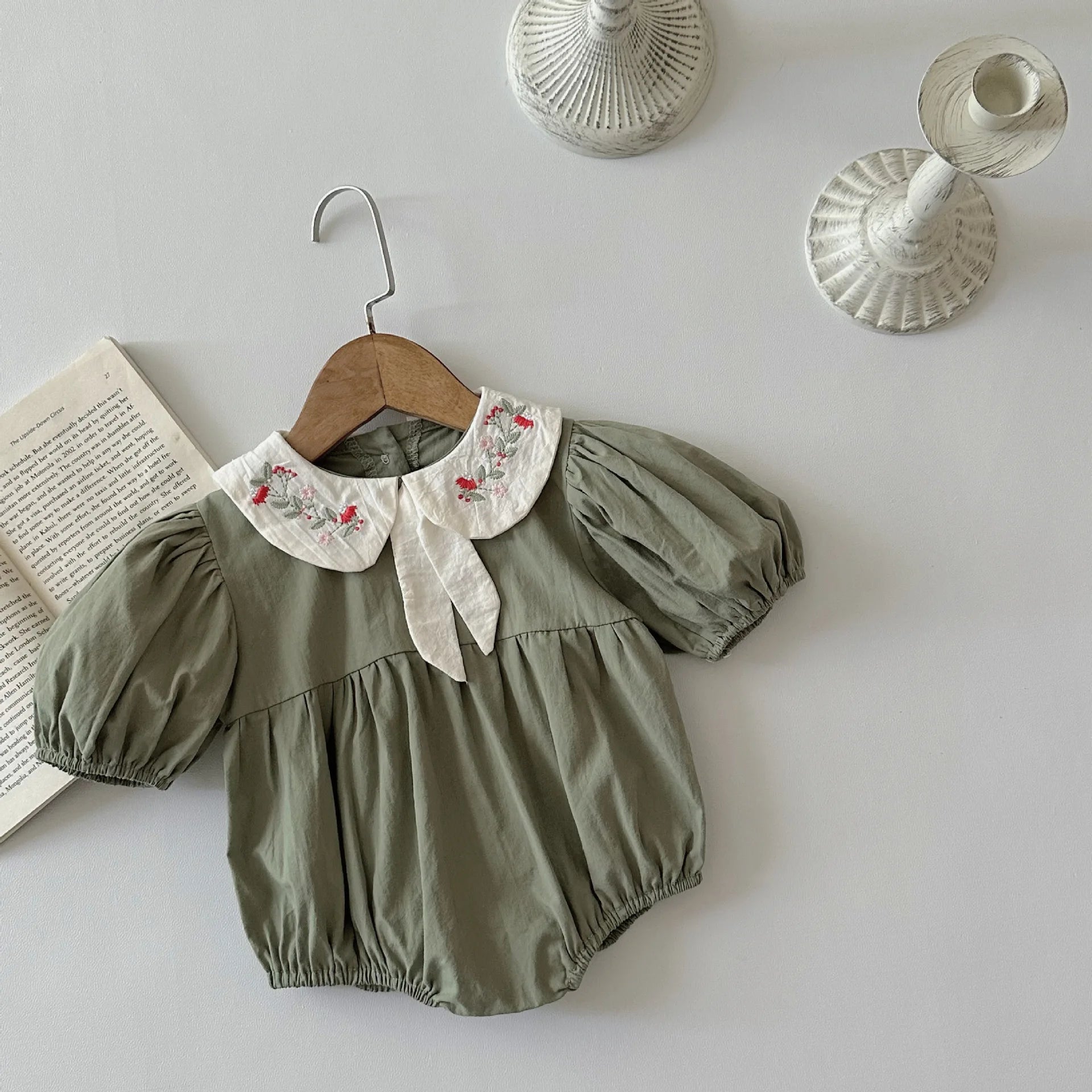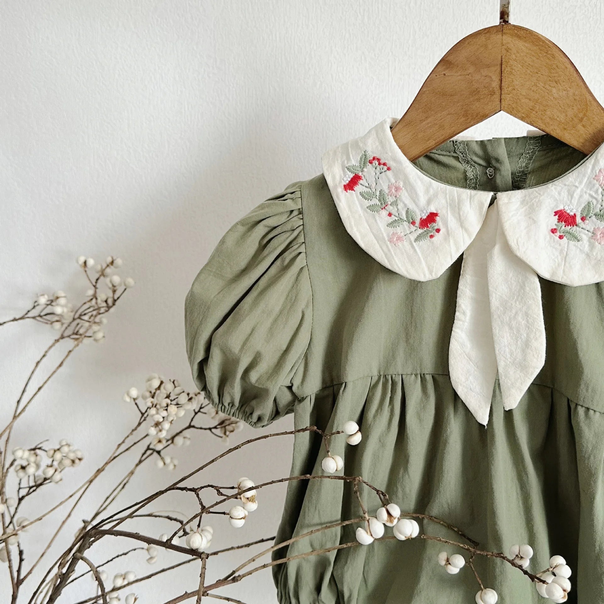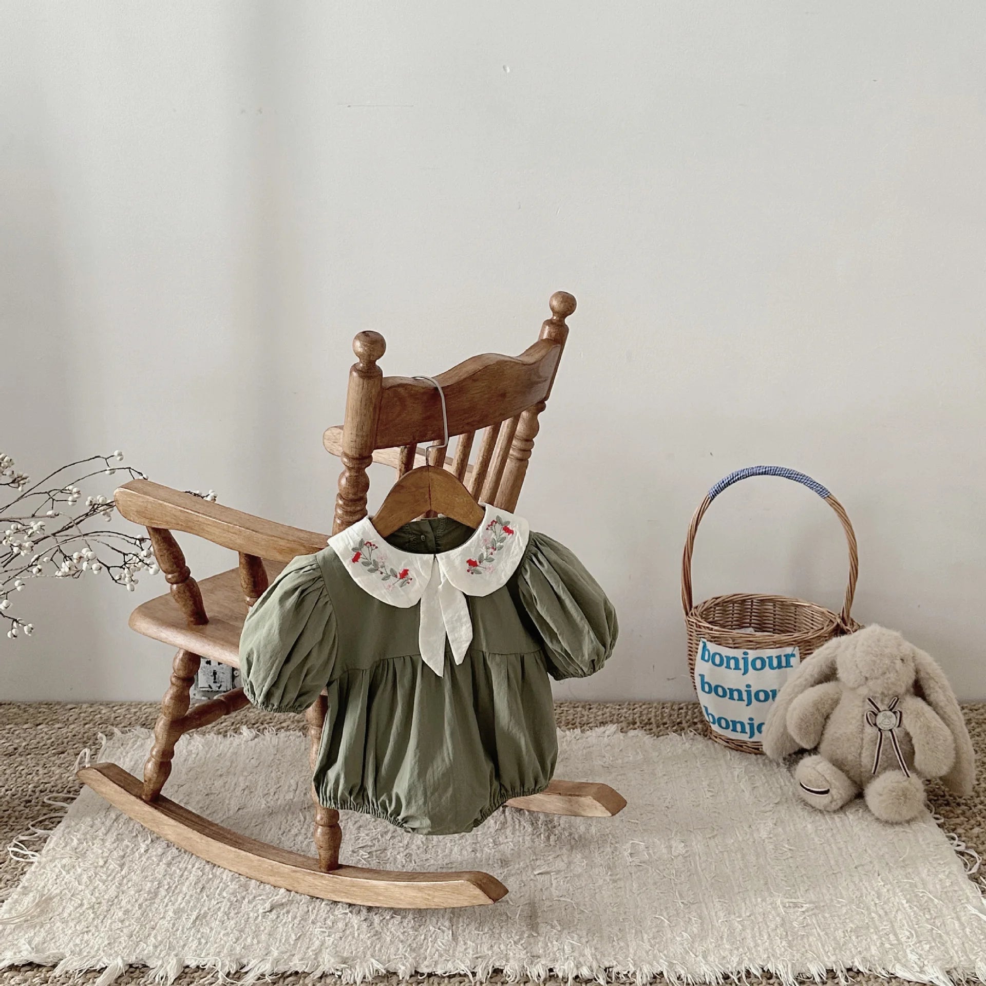 Stylowe body niemowlęce w kolorze zgaszonej oliwki, ozdobione efektownym kołnierzykiem z haftowanymi kwiatkami i wiązaniem z przodu. Krój z krótkim rękawem i delikatnie bufiastą formą nadaje całości wyjątkowy, retro wygląd, który świetnie sprawdzi się zarówno na co dzień, jak i na specjalne okazje.