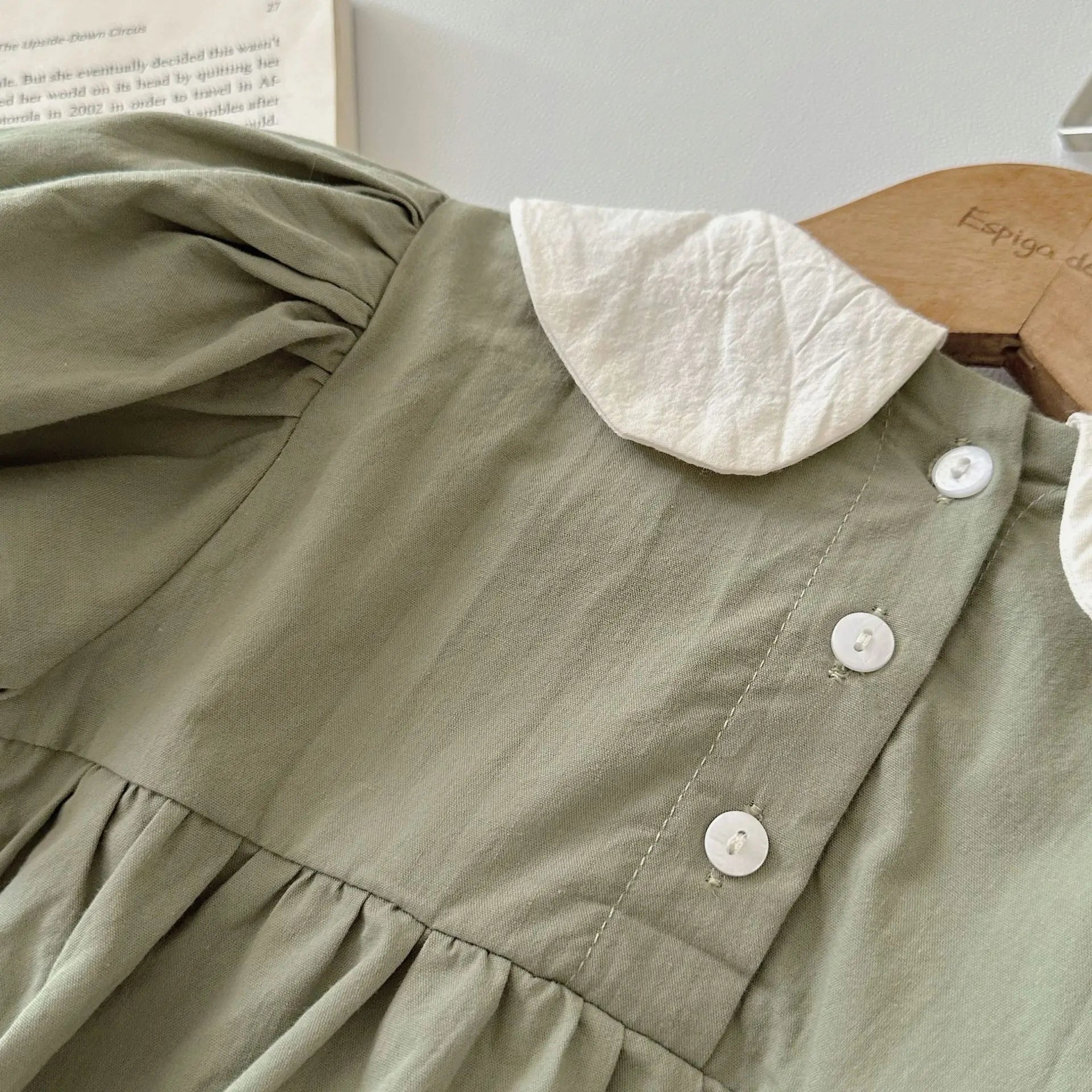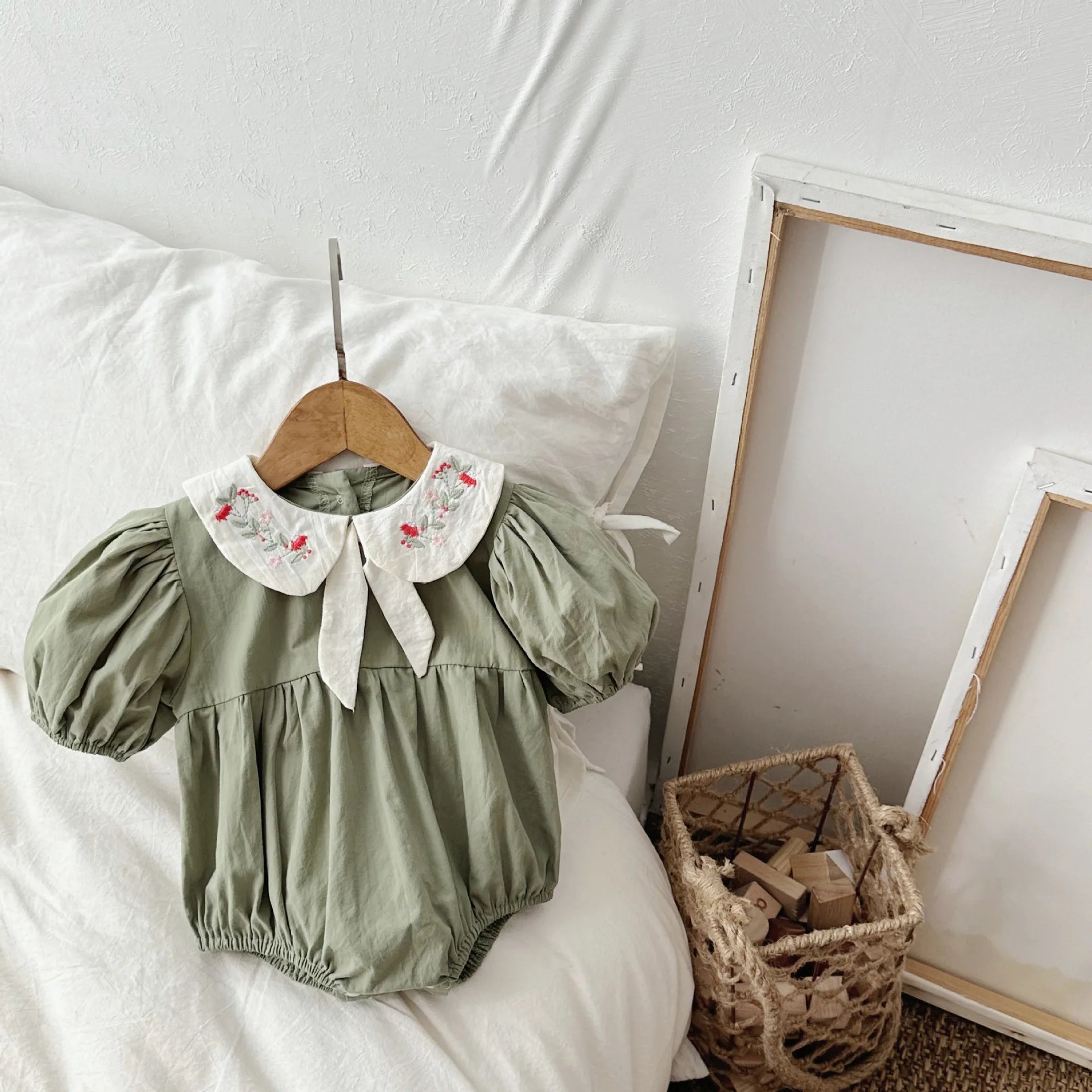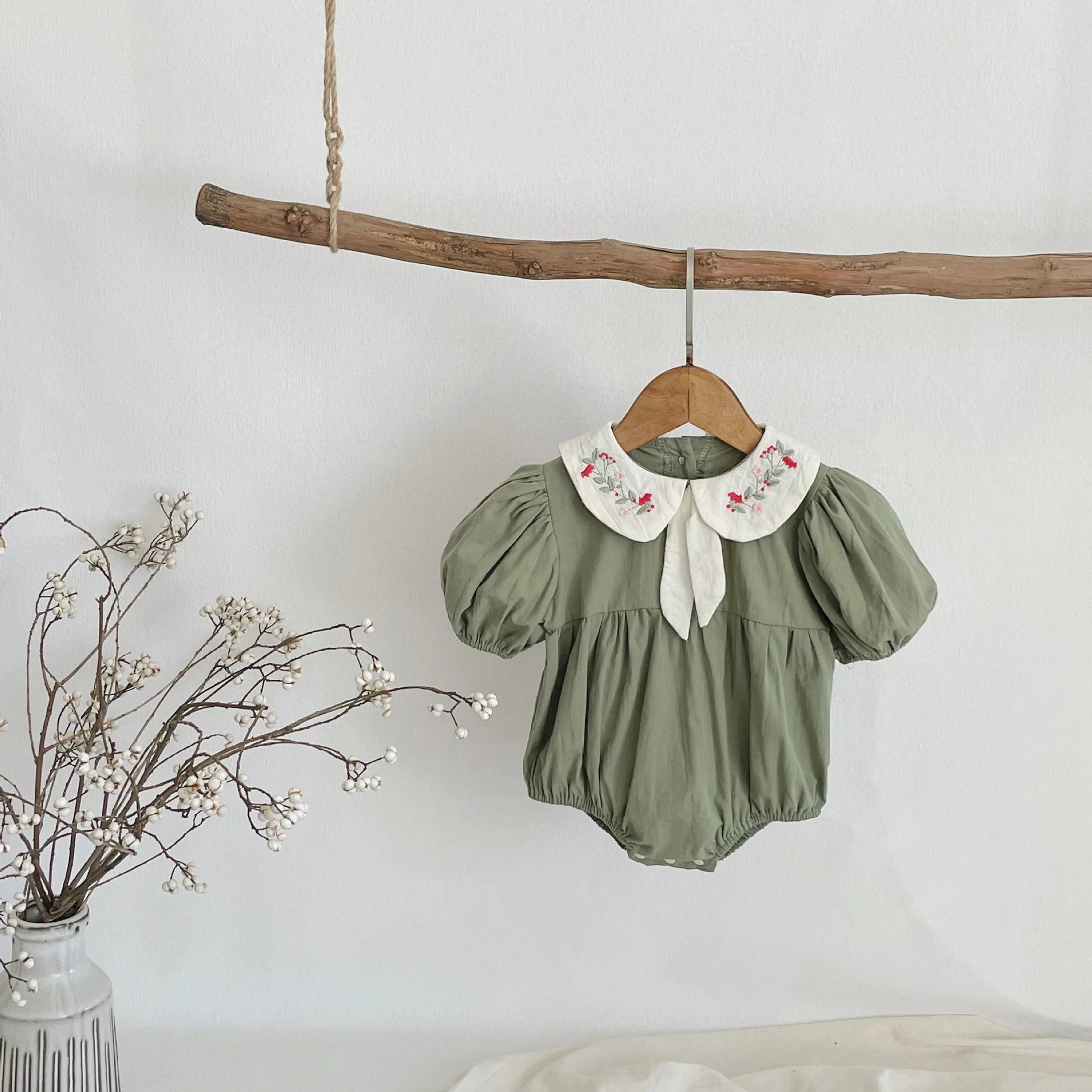 Stylowe body niemowlęce w kolorze zgaszonej oliwki, ozdobione efektownym kołnierzykiem z haftowanymi kwiatkami i wiązaniem z przodu. Krój z krótkim rękawem i delikatnie bufiastą formą nadaje całości wyjątkowy, retro wygląd, który świetnie sprawdzi się zarówno na co dzień, jak i na specjalne okazje.